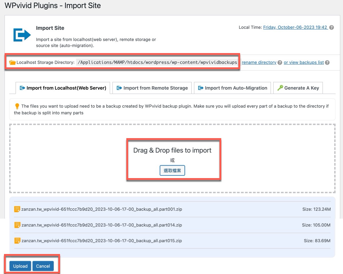 選擇匯入檔案。在此再是選擇第五步驟所下載的15個zip壓縮檔,仔細頁面所示的上傳路徑其實就是我的電腦裡面WordPress的備份資料夾,所以這裡的匯入在實質上是把電腦裡的檔案從原來位置複製到特定資料夾。同樣道理。如果真的是遠端伺服器主機的話,匯入檔案就是透過網路將我電腦裡面的檔案複製貼上到雲端的電腦主機某個資料夾位置,或者說是某個網址。