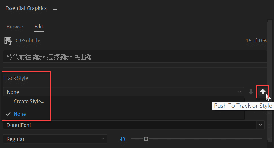 字幕設定好之後,回到頁面開始位置有個向上箭頭,將滑鼠游標移到箭頭,說明文字為「Push To Track or Style」,意思是將調整好的設定套用到軌道(Track)或者樣式(Style)中,在左邊可以選擇是否建立樣式(「Create Style」)。影片字幕通常都是相同的屬性設定,因此可直接選擇「None」即可。