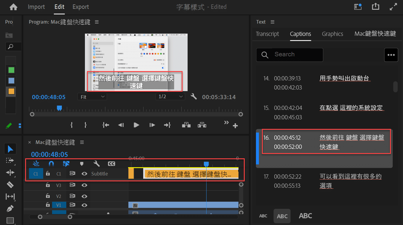 從影片序列的字幕軌道中,選擇任何一個字幕區塊,「Essential Graphics(基本圖形)」視窗中會出現關於這一塊字幕的編輯設定。