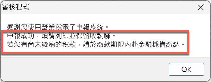 接下來會有單純的訊息視窗,提示目前已經申報成功:「煩請列印並保留收執聯」,這裡可以按下「OK」,如此完成了整個營業稅離線建檔系統申報和繳納的程序。