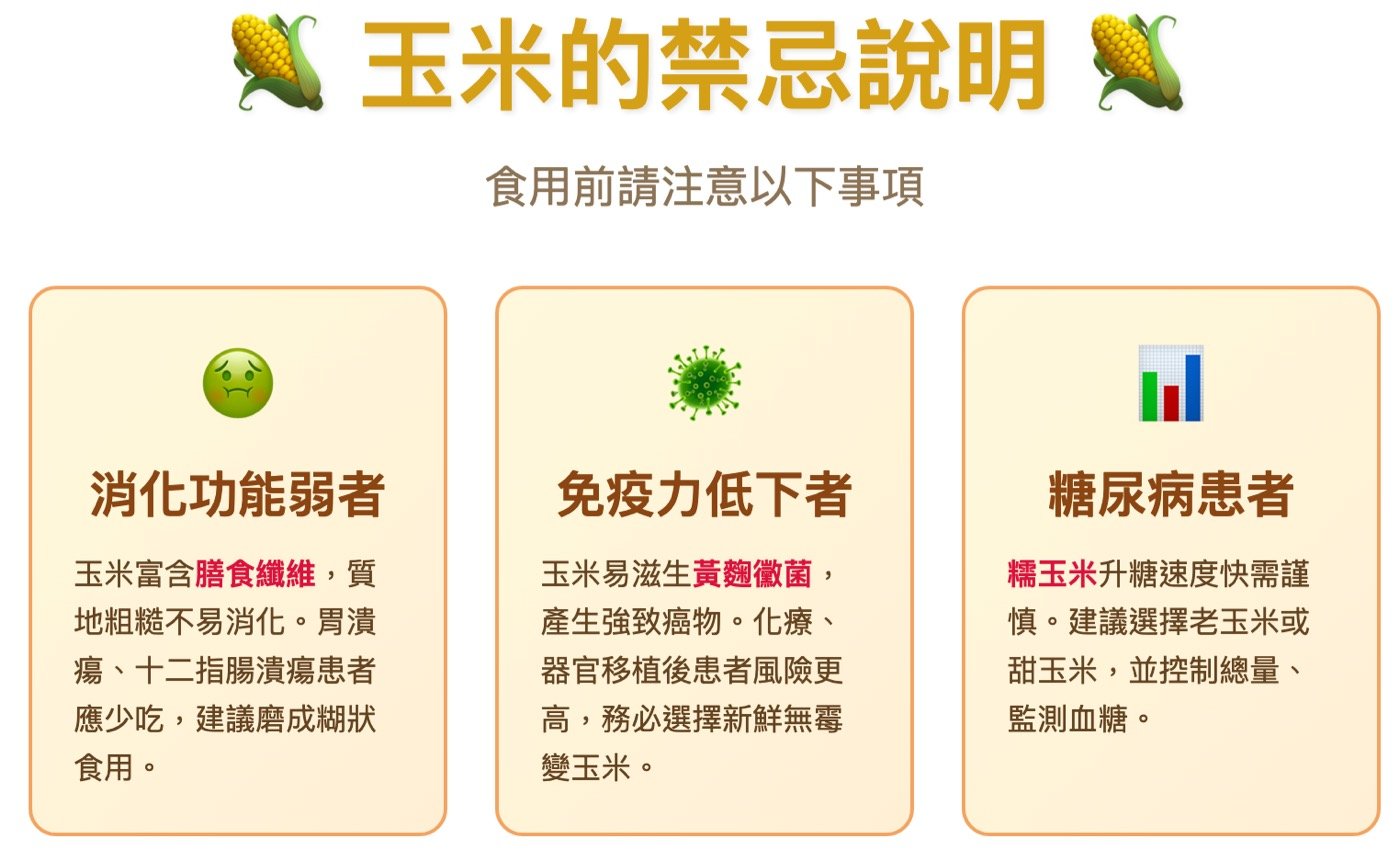 禁忌原因:玉米若儲存不當,容易滋生黃麴黴菌,產生強致癌物黃麴毒素。對於免疫力正常的人,偶爾微量攝入問題不大,但免疫力低下者(如正在化療、器官移植後、愛滋病患者)感染風險更高,危害更大。