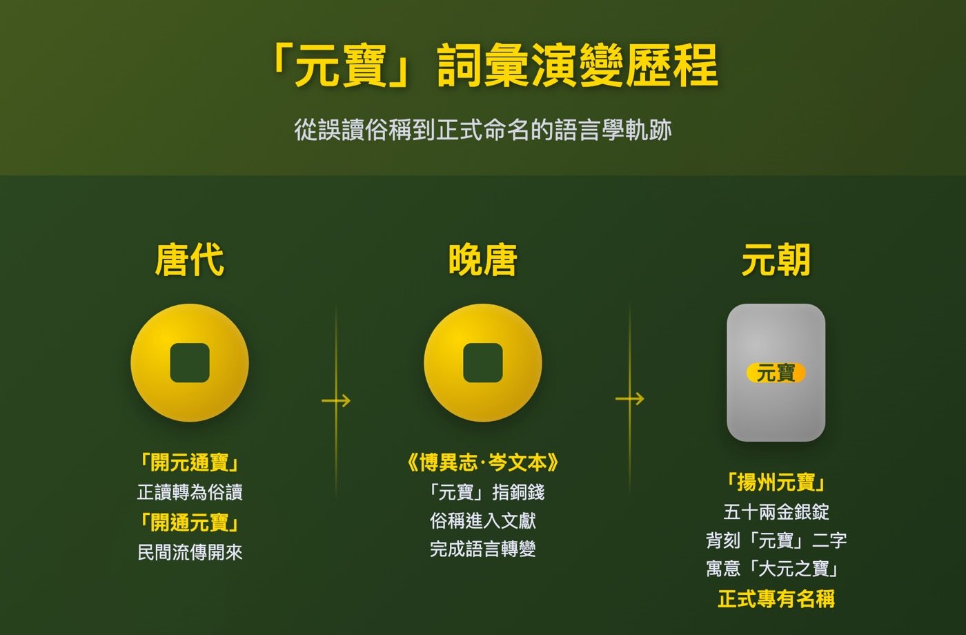 「元寶」最早並非指金銀錠,而是來自唐代新錢「開元通寶」的讀法變化。因為當時人們有時將錢文旋轉讀成「開通元寶」,「元寶」便開始進入民間語彙,成為銅錢的俗稱。晚唐《博異志‧岑文本》中,已有「元寶」意指銅錢的記載。於是民間俗稱進入文獻,不再只是口耳相傳的習慣。從銅錢到語言,再到文字,元寶一詞悄然完成了轉變。