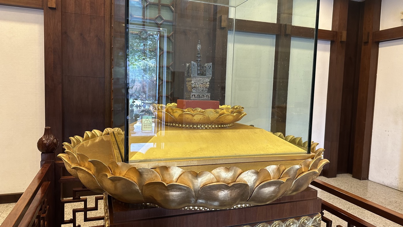 這批文物除了常見的古錢幣銅鏡之外,有個最珍貴的純銀打造阿育王塔,在一座很多浮雕佛教圖像的迷你小塔中,縫隙中隱約可見一個金色的小盒子,那是珍貴的佛螺髻髮舍利子,佛祖圓寂之後留下的一組頭髮。