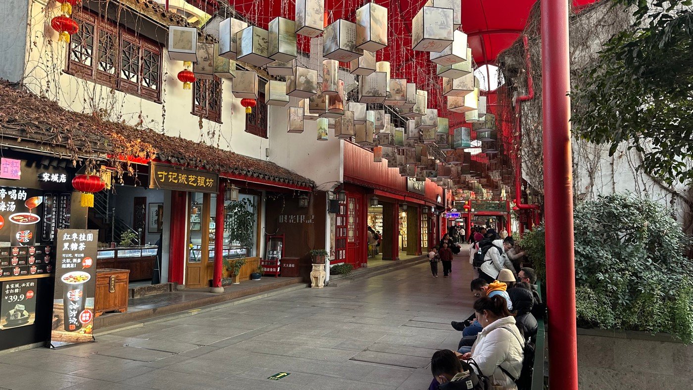 首先是參考著名畫作清明上河圖,栩栩如生呈現南宋時期的杭州市井生活街景面貌,遊客仿佛穿越時空回到古代逛街。