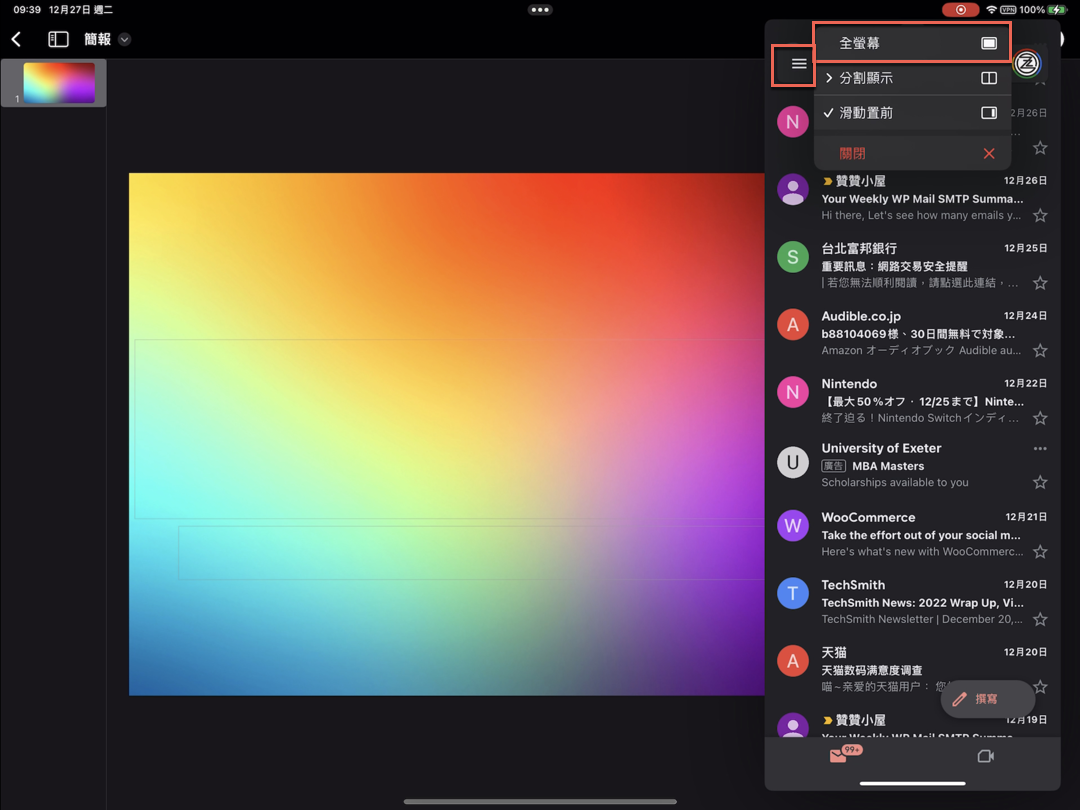 首先,目前是簡報APP全螢幕使用中,在右邊有個iPad滑動置前的Gmail視窗。