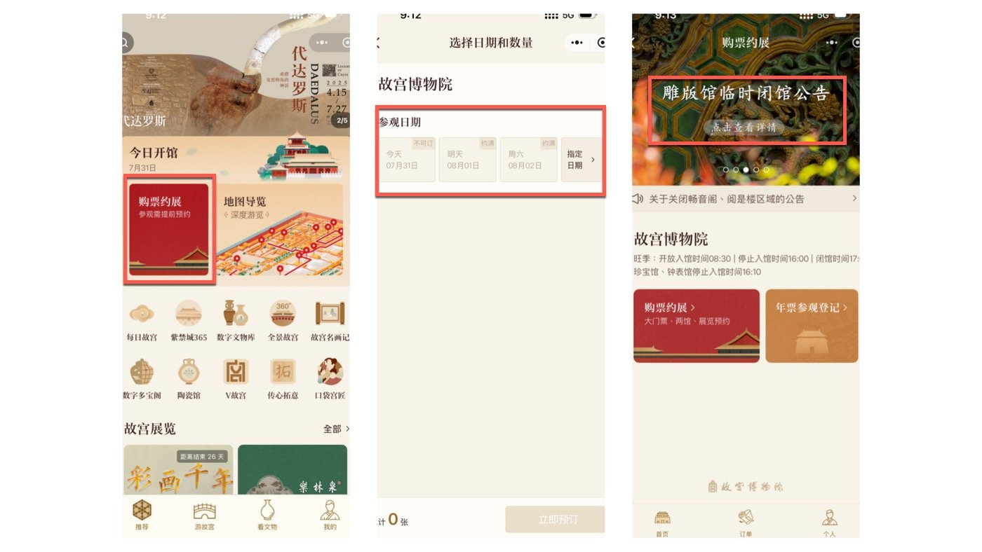 具體操作流程可以參考下列截圖,在微信搜索「故宮博物院」,選擇購票,按照畫面指示即可,台胞證也可以登記預約,另外在此同時會看到閉館公告的相關資訊。