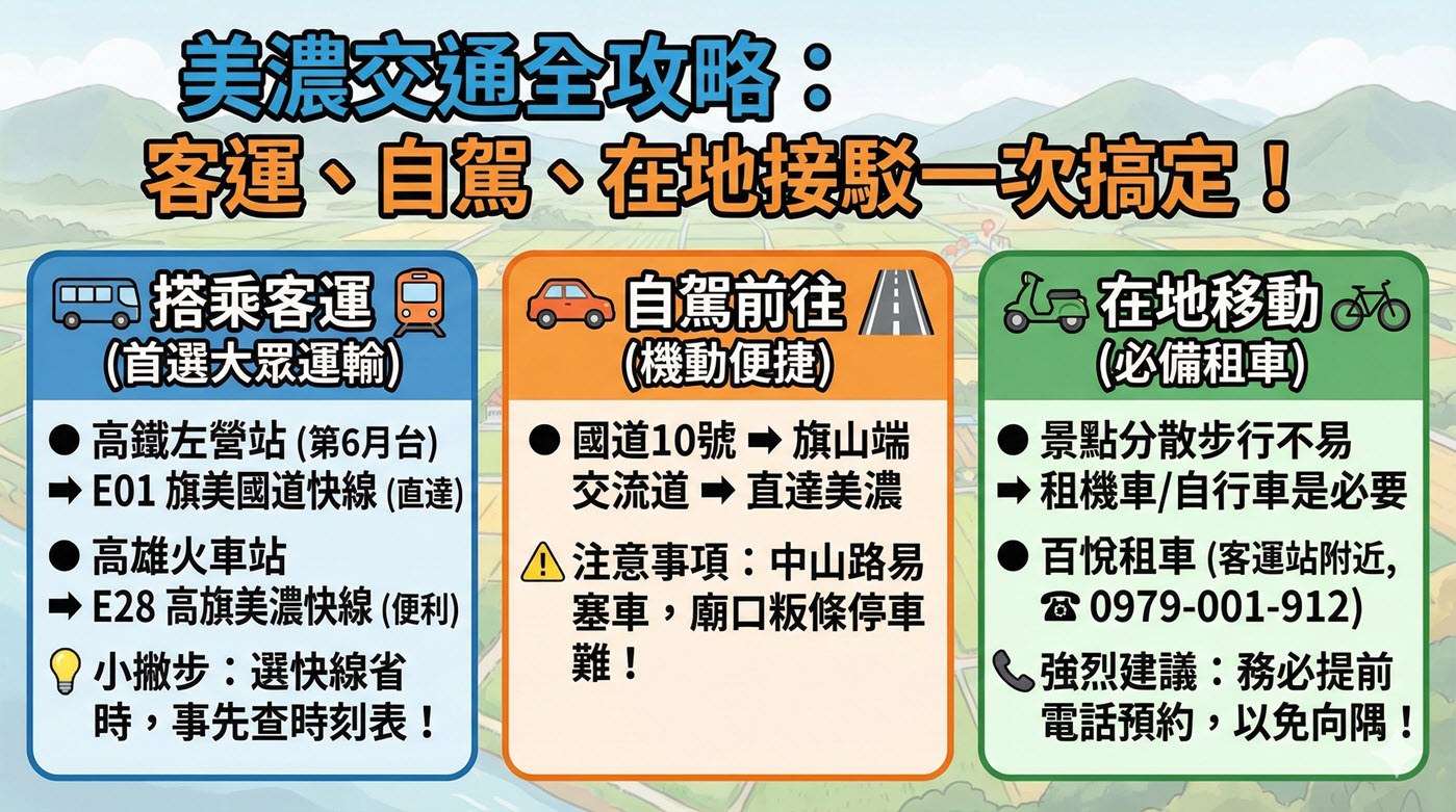 美濃交通怎麼去?首選是從高鐵左營站搭乘「旗美國道快線E01」,或從高雄車站搭E28。贊贊小屋特別提醒,務必確認搭到「快線」才能大幅節省時間!開車族走國道10號旗山端下交流道最快,但鎮內景點分散,沒開車的話強烈建議租機車代步,且務必提前電話預約喔!
