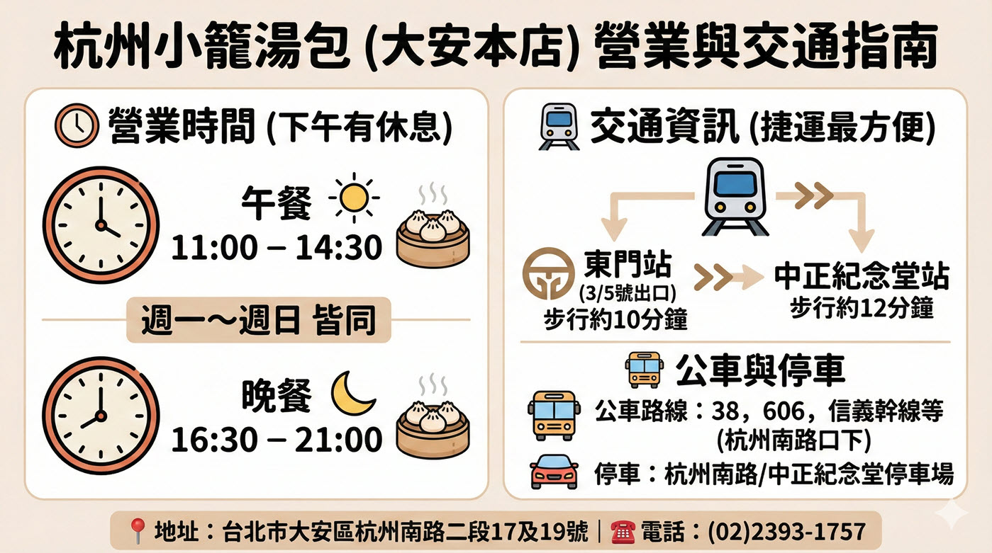 杭州小籠湯包營業時間11:00–14:30、16:30–21:00,交通方式是捷運淡水信義線東門站,從 3號或5號出口出來後沿信義路三段走,大約十分鐘到達。另外從中正紀念堂站出發也是差不多的距離。