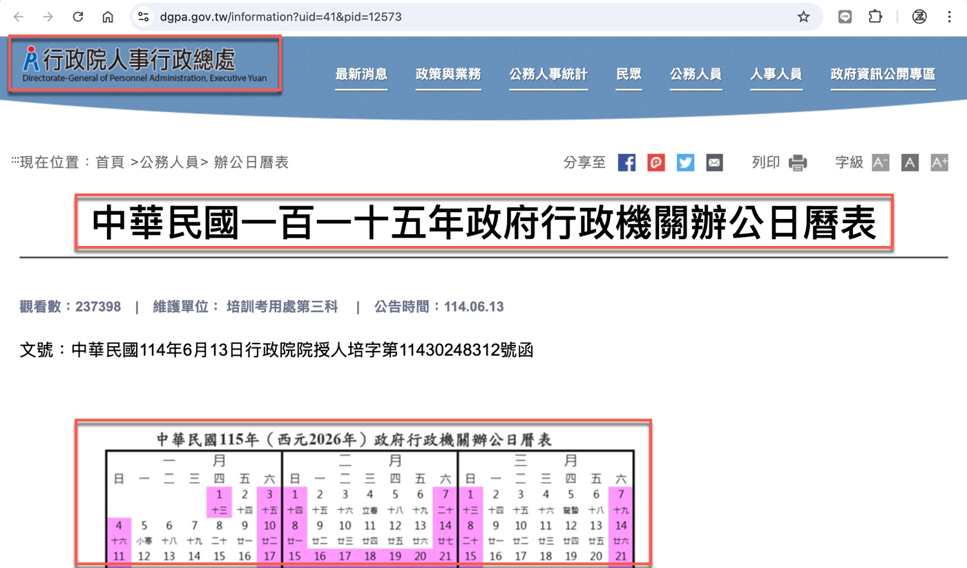 放假資訊如此基本且重要,其實在網路上搜尋很容易可以得到答案,拿這個問題去問AI,也能得到豐富有料的回答。可是,畢竟在比較正式的工作場合,還是希望能有明確的資料來源,而這部分最權威的是行政院人事行政總處每年的公告。