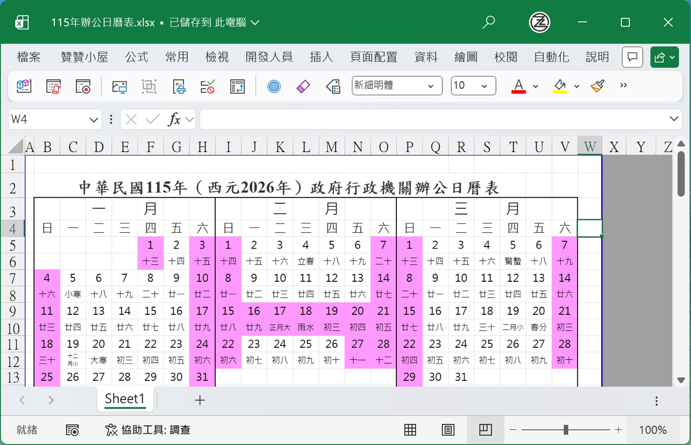例如這裡看到的是「中華民國一百一十五年政府行政機關辦公日曆表」,便是政府機關正式發布的函文,在網頁上有以休假資訊為主的行事曆,一目瞭然。