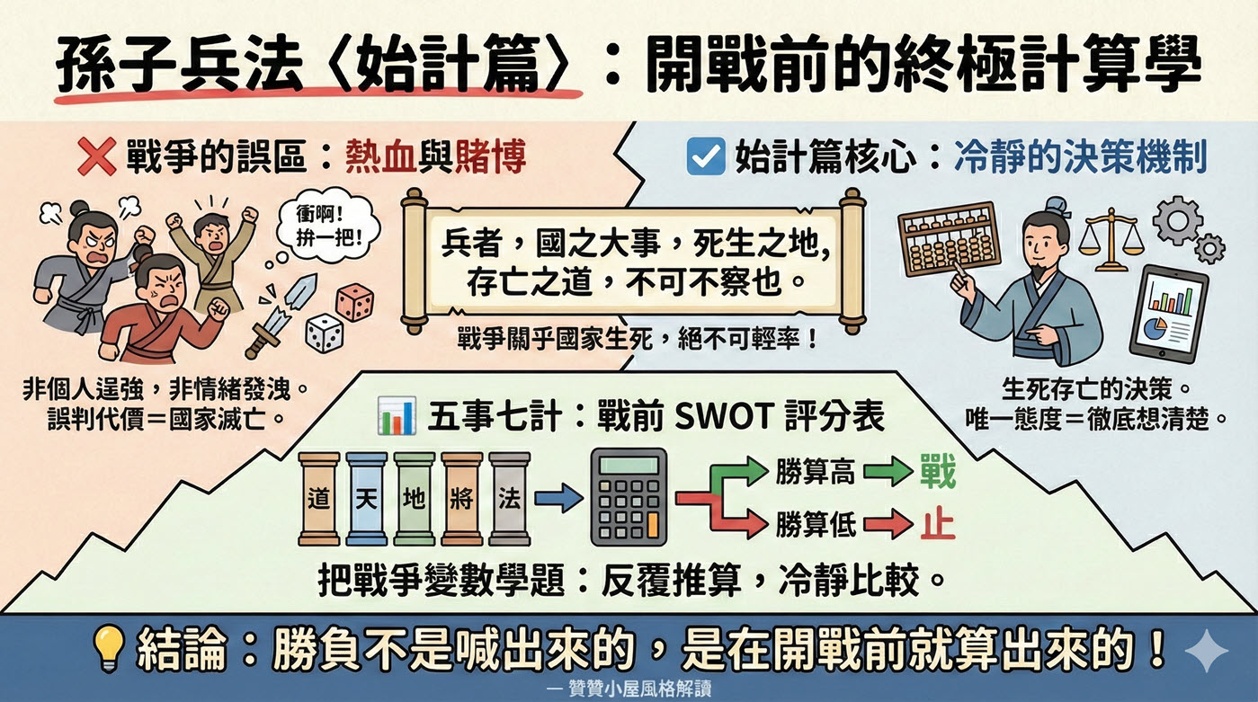 始計解析破題就是在說:戰爭不是打了再看結果,而是在開戰前就必須把勝負算清楚。孫子用「兵者,國之大事」點破核心,提醒決策者先評估生死存亡的代價,再用五事七計冷靜比較條件,確認能勝才出手,避免一時衝動把國家推向不可逆的風險。