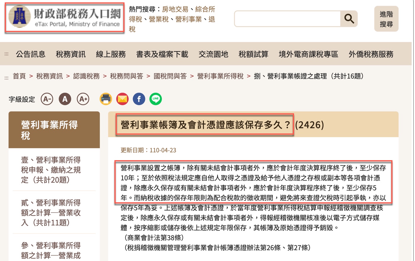 這部份相關規定,可參考財政部稅務入口網資訊:營利事業帳簿及會計憑證應該保存多久?
