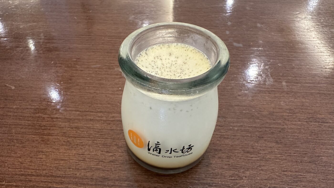 大雄寶殿山腳下的素雅餐廳吃布丁,實在是奇特難忘的體驗。那布丁裝在一個小巧精美的玻璃瓶中,瓶身簡單寫著三個字「滴水坊」,如同一個小小佛燈,令人心生歡喜。