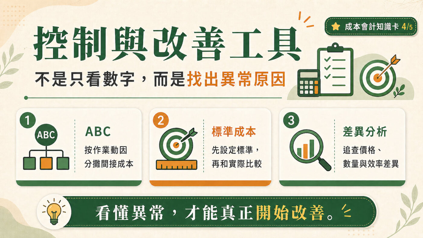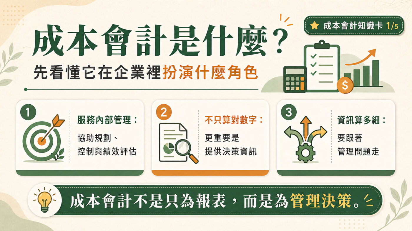 成本會計重點在於掌握成本分類架構、核心計算制度、差異控制工具到決策分析的完整脈絡。本篇從成本會計的基本定位出發,依序整理七大核心概念,兼顧理論邏輯與實務工作的連結,讓讀者讀完不只看懂架構,也知道這些工具在工作現場如何真正派上用場。