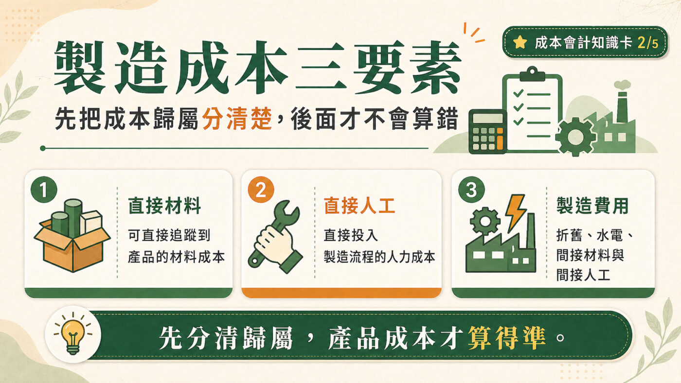 製造業的製造成本計算由三個要素構成:直接材料、直接人工,以及製造費用。前兩者可以直接追蹤到特定產品,製造費用則是與生產活動相關、但無法直接追蹤到特定產品的間接製造支出,包括廠房租金、機器折舊、間接材料、工廠管理人員薪資與工廠水電費等。這三條線的範圍一旦劃清,計算產品成本時才不會出現歸屬錯誤。