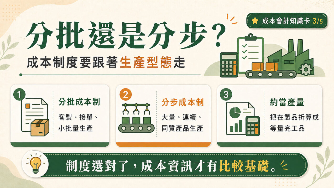 成本制度的選擇,基本上由生產方式決定。分批成本制適用於每批產品可以單獨辨識的環境,例如接單製造的機械廠、模具廠或工程業,每一張製令單就是獨立的成本計算對象,完工後可以精確算出這批訂單的材料耗用、工時投入與分攤製造費用。分步成本制則適用於大量連續的同質產品,例如石化、食品或電子零組件,成本不以訂單為單位計算,而是依部門逐步累積,再除以約當產量得出單位成本。