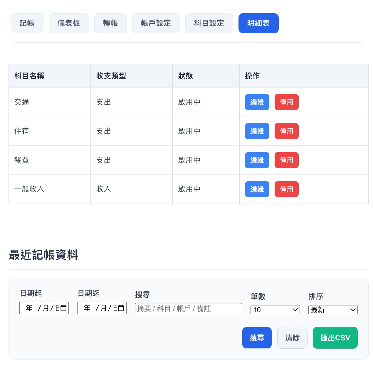 只要輸入日期、帳戶、金額、摘要,系統就會整理好。沒有多餘欄位,沒有借貸門檻,真正降低開始記帳的心理阻力。