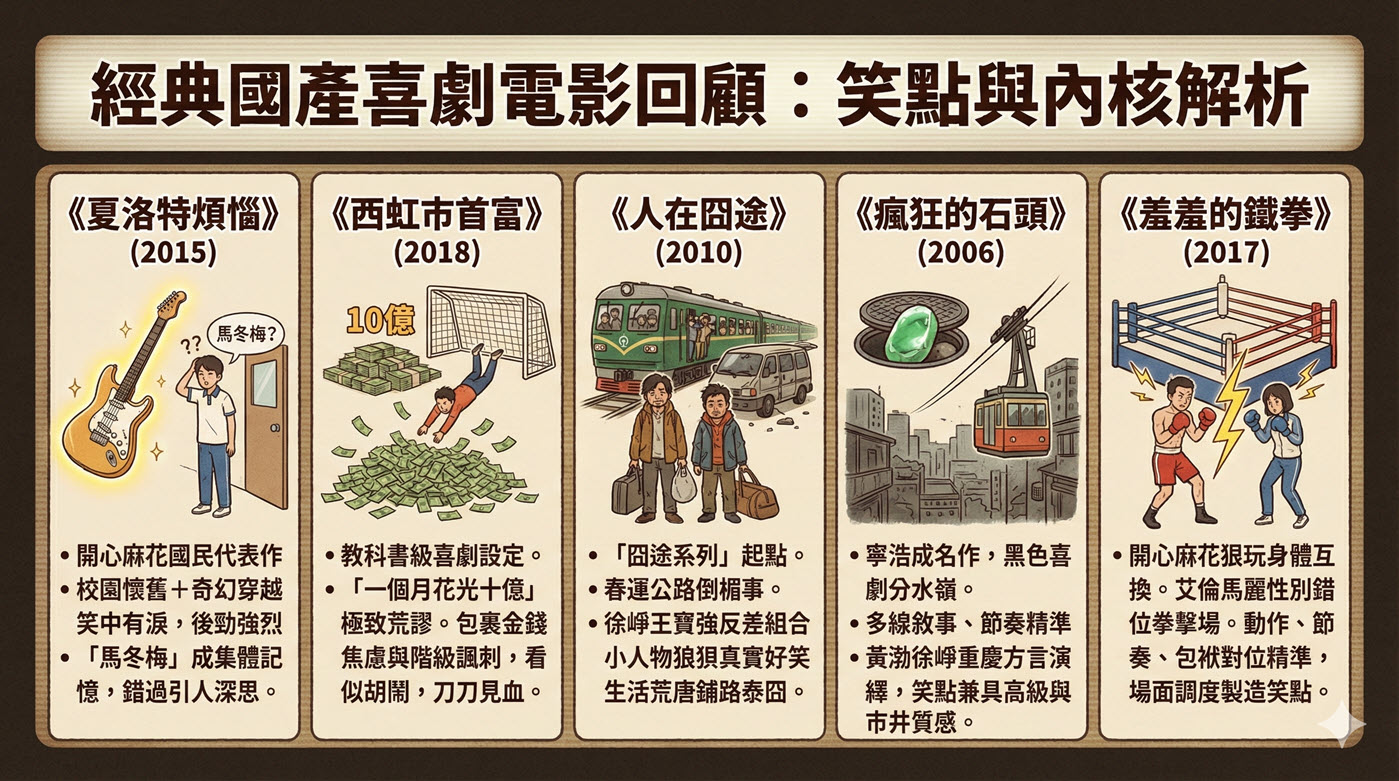 大陸喜劇電影推薦首選《夏洛特煩惱》、《西虹市首富》、《人在囧途》、《瘋狂的石頭》、《羞羞的鐵拳》,這些作品都是2010年代票房口碑的佳作,代表過去那個時期的經典,類型從校園懷舊、金錢諷刺到黑色幽默,不只好笑,更貼近現實情緒,是想輕鬆看又不想看空片時最安全的片單。