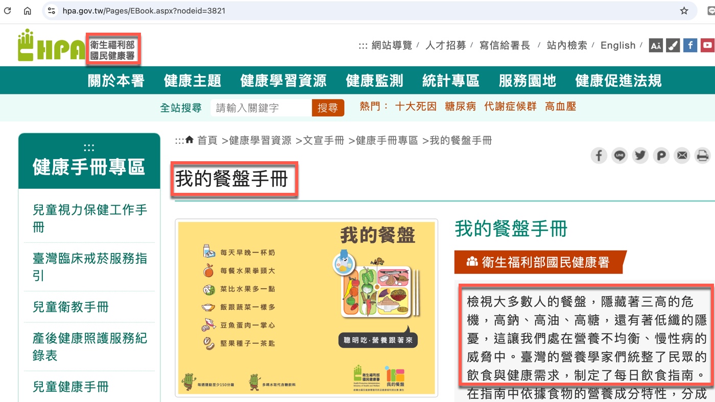 健康食品查詢可以參考衛生福利部國民健康署推出的「我的餐盤手冊」電子書,教你怎麼吃才健康又營養。這份手冊是把官方的 每日飲食指南 用更生活化的方式整理成一本可下載的 PDF,讓你不用看一大串理論,就能掌握均衡飲食的核心概念。